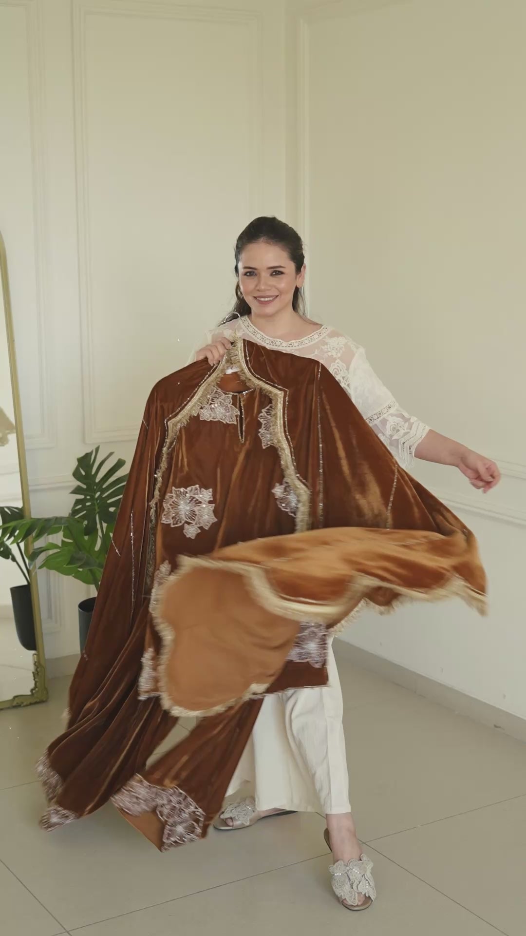 Short velvet kurta paired with a farzi salwar embroidered pant having a dupatta with scallop cut.
