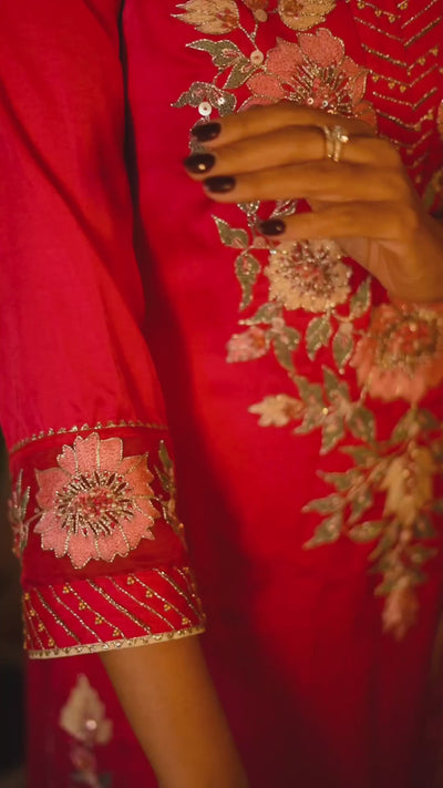 Straight kurta with intricate neckline embroidery and organza detail sleeve, paired with an organza detail palazzo with a sequence and gota embroidered organza dupatta
